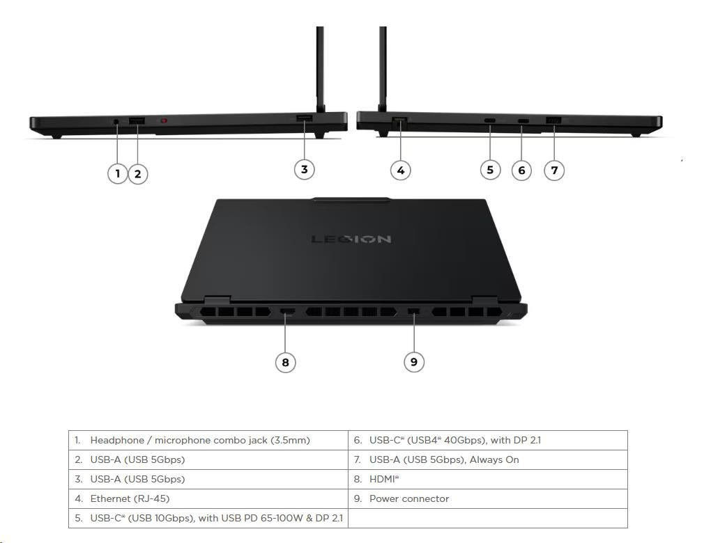 Standartné porty | 2x USB-A (USB 5Gbps / USB 3.2 Gen 1) 1x USB-A (USB 5Gbps / USB 3.2 Gen 1), Always On 1x USB-C (USB 10Gbps / USB 3.2 Gen 2), with USB PD 65-100W and DisplayPort™ 2.1 1x USB-C (USB4 40Gbps), with DP 2.1 1x HDMI 2.1, up to 8K/60Hz 1x Headphone / microphone combo jack (3.5mm) 1x Ethernet (RJ-45) 1x Power connector |