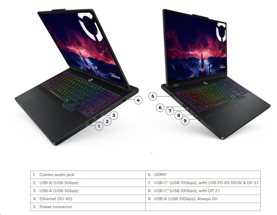 | Standartné porty | 2x USB-A (USB 5Gbps / USB 3.2 Gen 1) 1x USB-A (USB 10Gbps / USB 3.2 Gen 2), Always On 1x USB-C (USB 10Gbps / USB 3.2 Gen 2), with DisplayPort™ 2.1 1x USB-C (USB 10Gbps / USB 3.2 Gen 2), with USB PD 65-100W and DisplayPort™ 2.1 1x HDMI 2.1, up to 8K/60Hz 1x Headphone / microphone combo jack (3.5mm) 1x Ethernet (RJ-45) 1x Power connector |