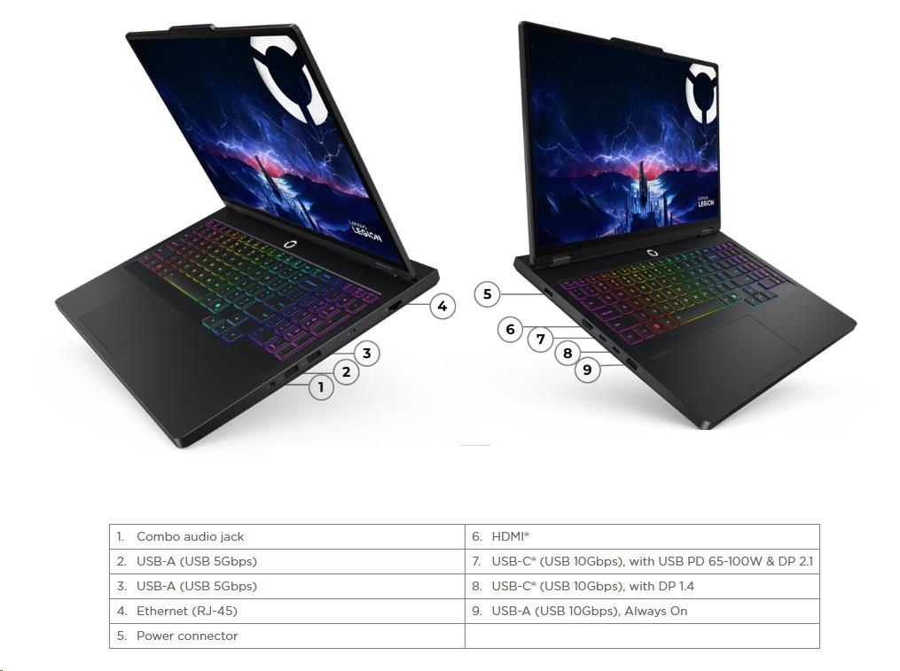| Standartné porty | 2x USB-A (USB 5Gbps / USB 3.2 Gen 1) 1x USB-A (USB 10Gbps / USB 3.2 Gen 2), Always On 1x USB-C (USB 10Gbps / USB 3.2 Gen 2), with USB PD 65-100W and DisplayPort™ 2.1 1x USB-C (USB 10Gbps / USB 3.2 Gen 2), with DisplayPort™ 1.4 1x HDMI 2.1, up to 8K/60Hz 1x Headphone / microphone combo jack (3.5mm) 1x Ethernet (RJ-45) 1x Power connector |