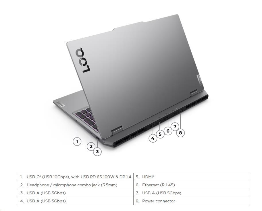 | Standartné porty | 3x USB-A (USB 5Gbps / USB 3.2 Gen 1) 1x USB-C (USB 10Gbps / USB 3.2 Gen 2), with USB PD 65-100W and DisplayPort™ 1.4 1x HDMI 2.1, up to 8K/60Hz 1x Headphone / microphone combo jack (3.5mm) 1x Ethernet (RJ-45) 1x Power connector |