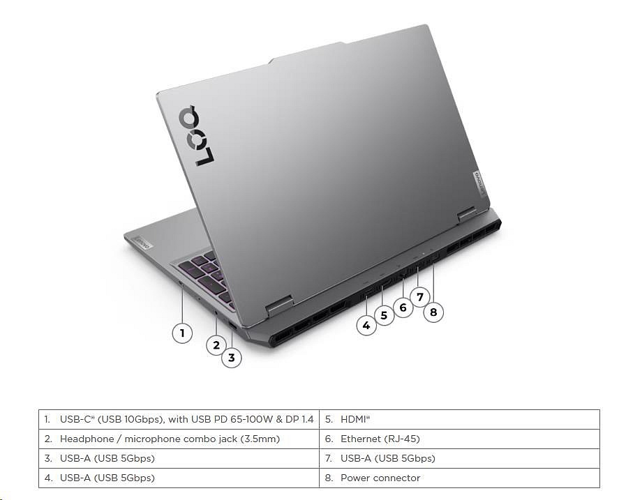 | Standartné porty | 3x USB-A (USB 5Gbps / USB 3.2 Gen 1) 1x USB-C (USB 10Gbps / USB 3.2 Gen 2), with USB PD 65-100W and DisplayPort™ 1.4 1x HDMI 2.1, up to 8K/60Hz 1x Headphone / microphone combo jack (3.5mm) 1x Ethernet (RJ-45) 1x Power connector |
