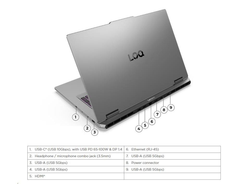 | Standartné porty | 4x USB-A (USB 5Gbps / USB 3.2 Gen 1) 1x USB-C (USB 10Gbps / USB 3.2 Gen 2), with USB PD 65-100W and DisplayPort™ 1.4 1x HDMI 2.1, up to 8K/60Hz 1x Headphone / microphone combo jack (3.5mm) 1x Ethernet (RJ-45) 1x Power connector |