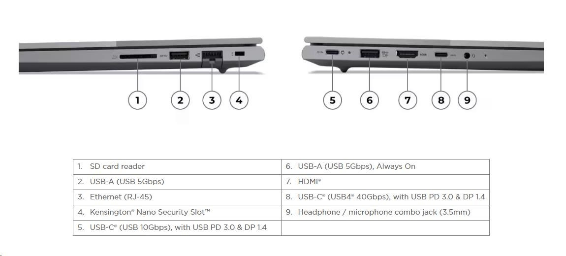 | Standartné porty | 1x USB-A (USB 5Gbps / USB 3.2 Gen 1) 1x USB-A (USB 5Gbps / USB 3.2 Gen 1), Always On 1x USB-C (USB 10Gbps / USB 3.2 Gen 2), with USB PD 3.0 and DisplayPort™ 1.4 1x USB-C (USB4 40Gbps), with USB PD 3.0 and DisplayPort™ 1.4 1x HDMI 2.1, up to 4K/60Hz 1x Headphone / microphone combo jack (3.5mm) 1x Ethernet (RJ-45) 1x SD card reader |