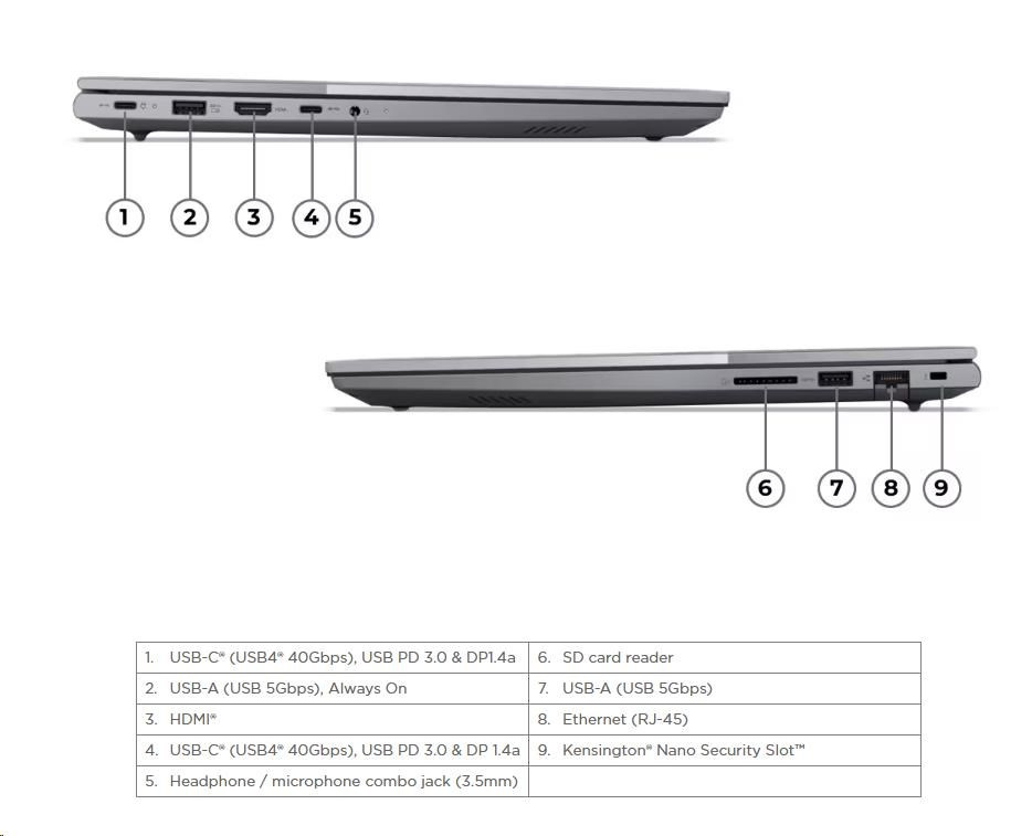 | Standartné porty | 1x USB-A (USB 5Gbps), Always On 1x USB-A (USB 5Gbps) 2x USB-C (USB4 40Gbps), with USB PD 3.0 and DisplayPort™ 1.4a 1x HDMI 2.1, up to 4K/60Hz 1x Headphone / microphone combo jack (3.5mm) 1x Ethernet (RJ-45) 1x SD card reader |