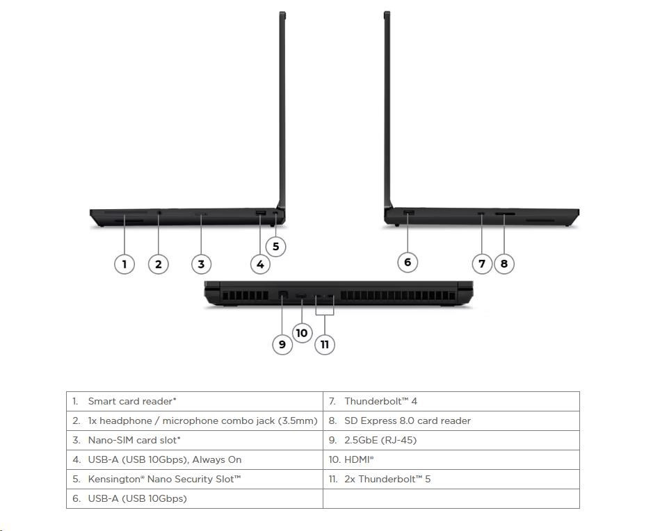 | Standartné porty | 1x USB-A (USB 10Gbps / USB 3.2 Gen 2), Always On 1x USB-A (USB 10Gbps / USB 3.2 Gen 2) 2x Thunderbolt™ 5, with DisplayPort™ 2.1 and USB PD 3.1, 180W input / 15W output 1x Thunderbolt™ 4, with DisplayPort™ 2.1 and USB PD 3.1, 180W input / 15W output 1x HDMI 2.1, up to 8K/60Hz 1x Headphone / microphone combo jack (3.5mm) 1x Ethernet (2.5GbE RJ-45) 1x SD Express 8.0 card reader |