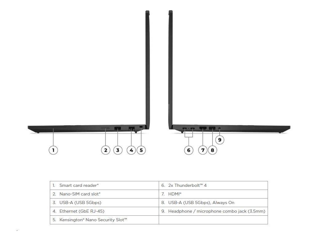 | Standartné porty | 1x USB-A (USB 5Gbps / USB 3.2 Gen 1) 1x USB-A (USB 5Gbps / USB 3.2 Gen 1), Always On 2x USB-C (Thunderbolt™ 4 / USB4 40Gbps), with PD 3.0 and DisplayPort™ 1.4 1x HDMI 2.1, up to 4K/60Hz 1x Headphone / microphone combo jack (3.5mm) 1x Ethernet (RJ-45) 1x Security keyhole |