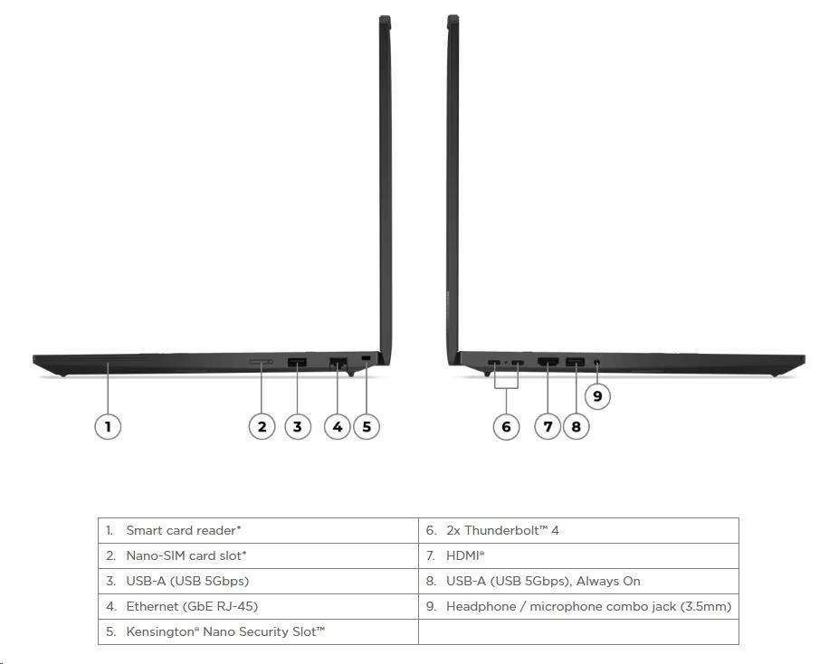 | Standartné porty | 1x USB-A (USB 5Gbps / USB 3.2 Gen 1) 1x USB-A (USB 5Gbps / USB 3.2 Gen 1), Always On 2x USB-C (Thunderbolt™ 4 / USB4 40Gbps), with PD 3.0 and DisplayPort™ 1.4 1x HDMI 2.1, up to 4K/60Hz 1x Headphone / microphone combo jack (3.5mm) 1x Ethernet (RJ-45) 1x Security keyhole  |
