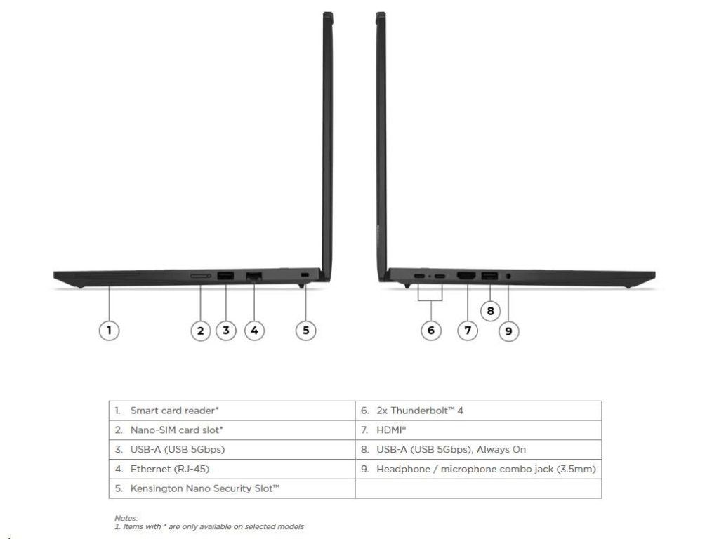 | Standartné porty | 1x USB-A (USB 5Gbps / USB 3.2 Gen 1) 1x USB-A (USB 5Gbps / USB 3.2 Gen 1), Always On 2x USB-C (Thunderbolt™ 4 / USB4 40Gbps), with USB PD 3.0 and DisplayPort™ 2.1 1x HDMI 2.1, up to 4K/60Hz 1x Headphone / microphone combo jack (3.5mm) 1x Ethernet (RJ-45) Optional Ports (configured) 1x Smart Card Reader 1x Nano-SIM Card Slot |