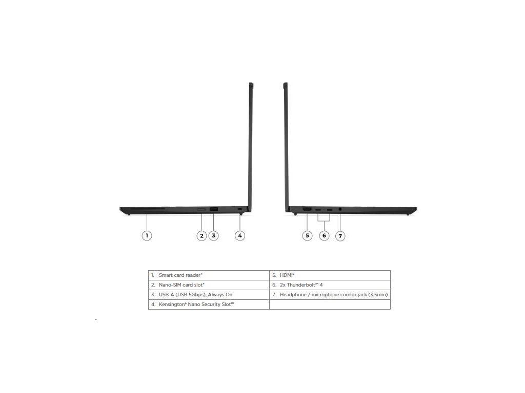 | Standartné porty | 1x USB-A (USB 5Gbps / USB 3.2 Gen 1), Always On 2x USB-C (Thunderbolt™ 4 / USB4 40Gbps), with USB PD 3.0 and DisplayPort™ 2.1 1x HDMI 2.1, up to 4K/60Hz 1x Headphone / microphone combo jack (3.5mm) |