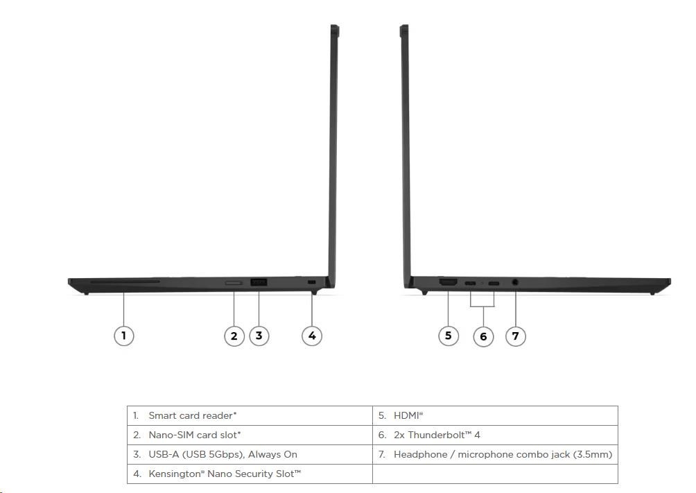 | Standartné porty | 1x USB-A (USB 5Gbps / USB 3.2 Gen 1), Always On 2x USB-C (Thunderbolt™ 4 / USB4 40Gbps), with USB PD 3.0 and DisplayPort™ 2.1 1x HDMI 2.1, up to 4K/60Hz 1x Headphone / microphone combo jack (3.5mm |
