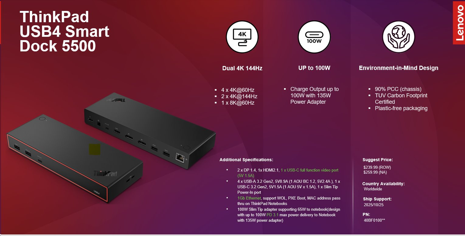 Lenovo ThinkPad USB4 Dock 5000 - PD100W (2x DP, 1x HDMI, 1x RJ45, 2x USB-C,4xUSB-A adapter) pripojit max 4x LCD