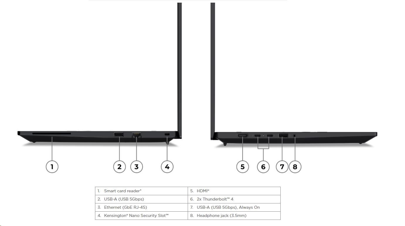 | Standartné porty | 1x USB-A (USB 5Gbps / USB 3.2 Gen 1) 1x USB-A (USB 5Gbps / USB 3.2 Gen 1), Always On 2x Thunderbolt™ 4, with USB PD 3.0 1x HDMI 2.1, up to 4K/60Hz 1x Headphone / microphone combo jack (3.5mm) 1x Ethernet (GbE RJ-45) 1x Security keyhole 1x Smart Card Reader |