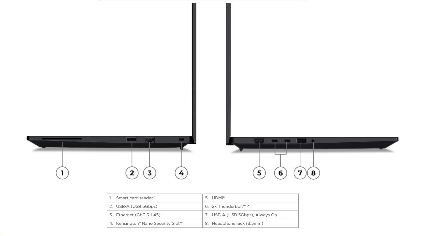 | Standartné porty | 1x USB-A (USB 5Gbps / USB 3.2 Gen 1) 1x USB-A (USB 5Gbps / USB 3.2 Gen 1), Always On 2x Thunderbolt™ 4, with USB PD 3.0 1x HDMI 2.1, up to 4K/60Hz 1x Headphone / microphone combo jack (3.5mm) 1x Ethernet (GbE RJ-45) 1x Security keyhole 1x Smart Card Reader |