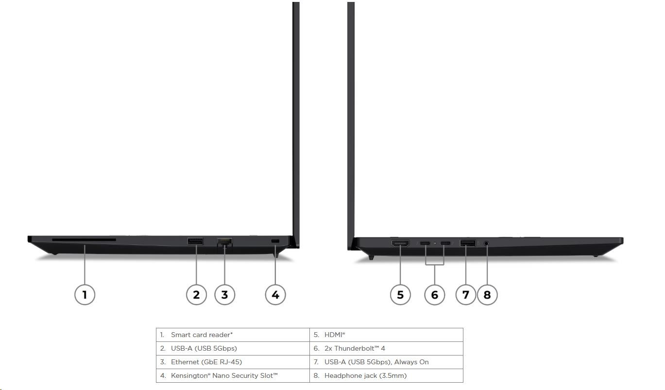 | Standartné porty | 1x USB-A (USB 5Gbps / USB 3.2 Gen 1) 1x USB-A (USB 5Gbps / USB 3.2 Gen 1), Always On 2x Thunderbolt™ 4, with USB PD 3.0 1x HDMI 2.1, up to 4K/60Hz 1x Headphone / microphone combo jack (3.5mm) 1x Ethernet (GbE RJ-45) 1x Security keyhole 1x Smart Card Reader |