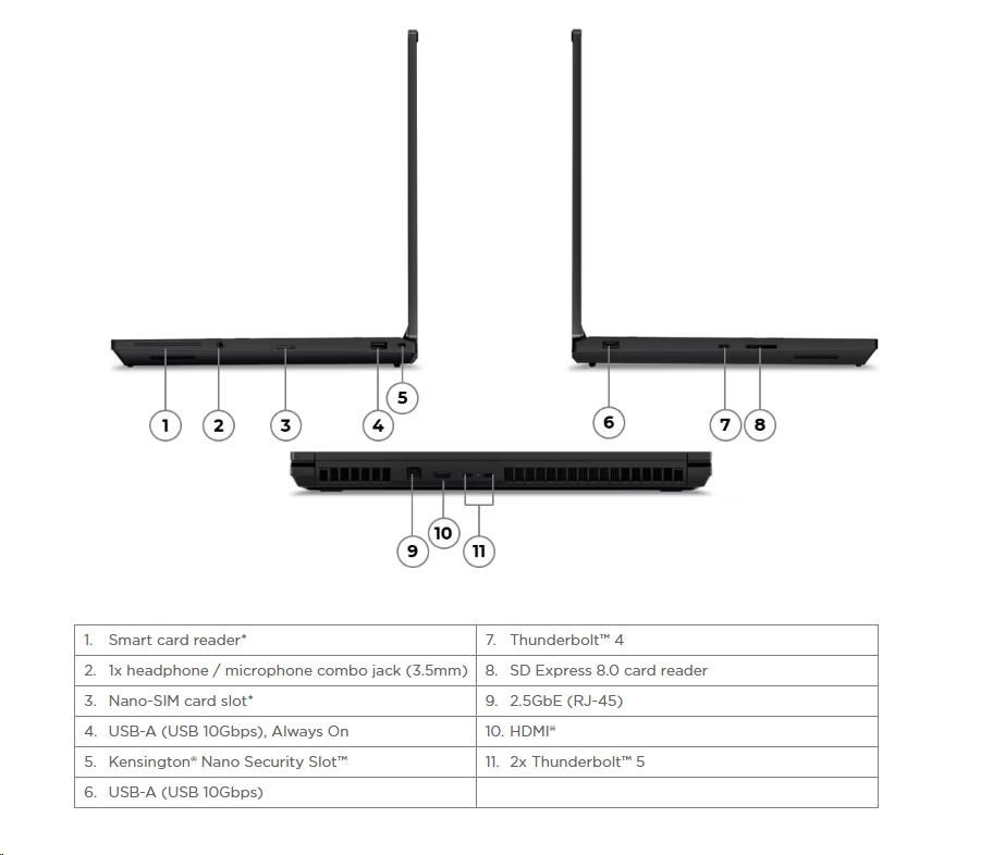 | Standartné porty | 1x USB-A (USB 10Gbps / USB 3.2 Gen 2), Always On 1x USB-A (USB 10Gbps / USB 3.2 Gen 2) 2x Thunderbolt™ 5, with DisplayPort™ 2.1 and USB PD 3.1, 180W input / 15W output 1x Thunderbolt™ 4, with DisplayPort™ 2.1 and USB PD 3.1, 180W input / 15W output 1x HDMI 2.1, up to 8K/60Hz 1x Headphone / microphone combo jack (3.5mm) 1x Ethernet (2.5GbE RJ-45) 1x SD Express 8.0 card reader |