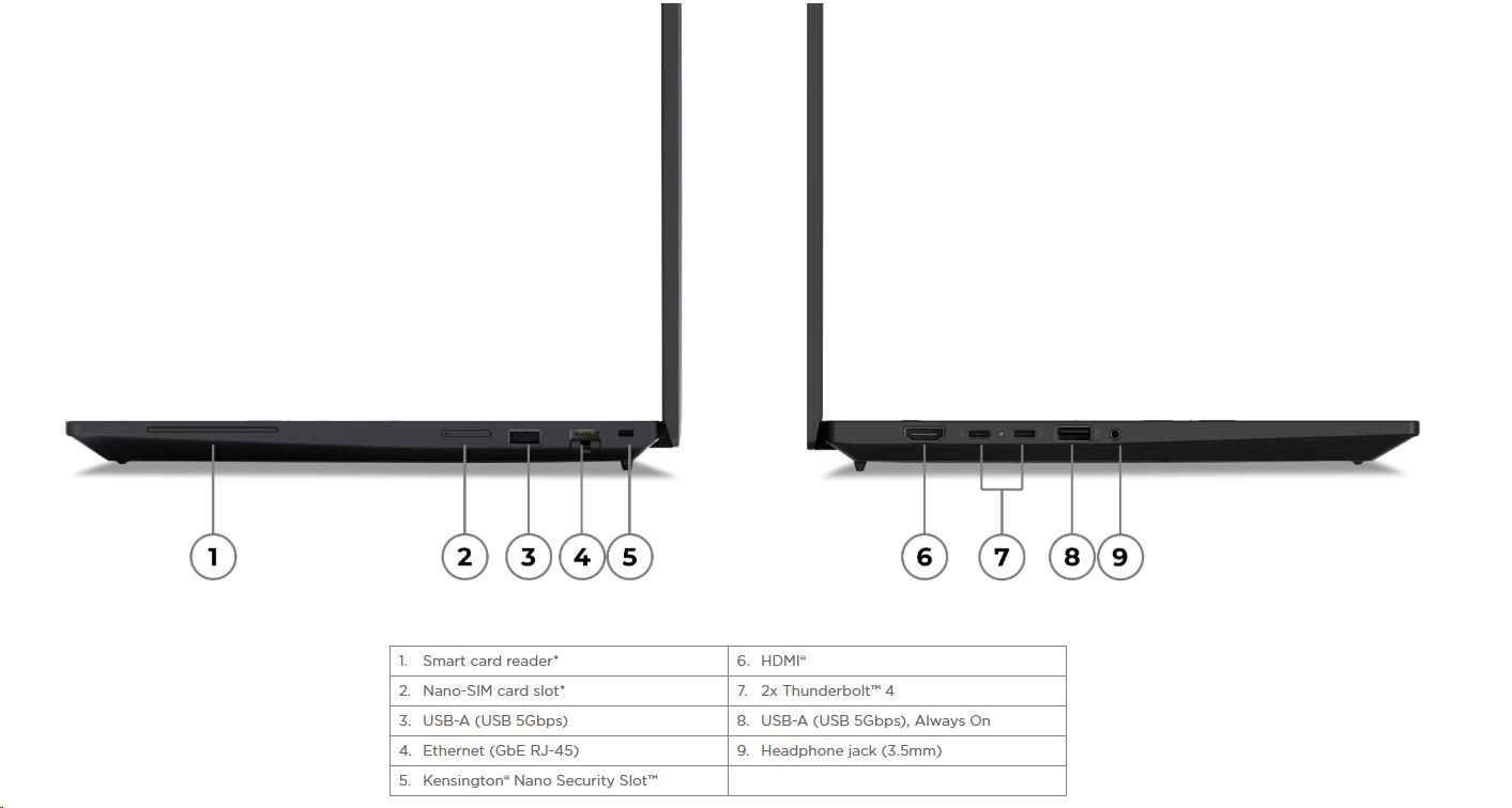 | Standartné porty | 1x USB-A (USB 5Gbps / USB 3.2 Gen 1) 1x USB-A (USB 5Gbps / USB 3.2 Gen 1), Always On 2x Thunderbolt™ 4, with USB PD 3.0 1x HDMI 2.1, up to 4K/60Hz 1x Headphone / microphone combo jack (3.5mm) 1x Ethernet (GbE RJ-45) 1x Security keyhole 1x Smart Card Reader |