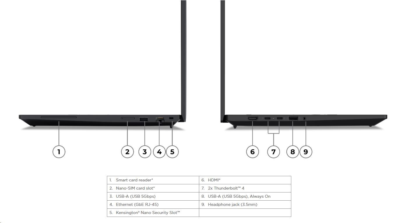 | Standartné porty | 1x USB-A (USB 5Gbps / USB 3.2 Gen 1) 1x USB-A (USB 5Gbps / USB 3.2 Gen 1), Always On 2x Thunderbolt™ 4, with USB PD 3.0 1x HDMI 2.1, up to 4K/60Hz 1x Headphone / microphone combo jack (3.5mm) 1x Ethernet (GbE RJ-45) 1x Security keyhole |