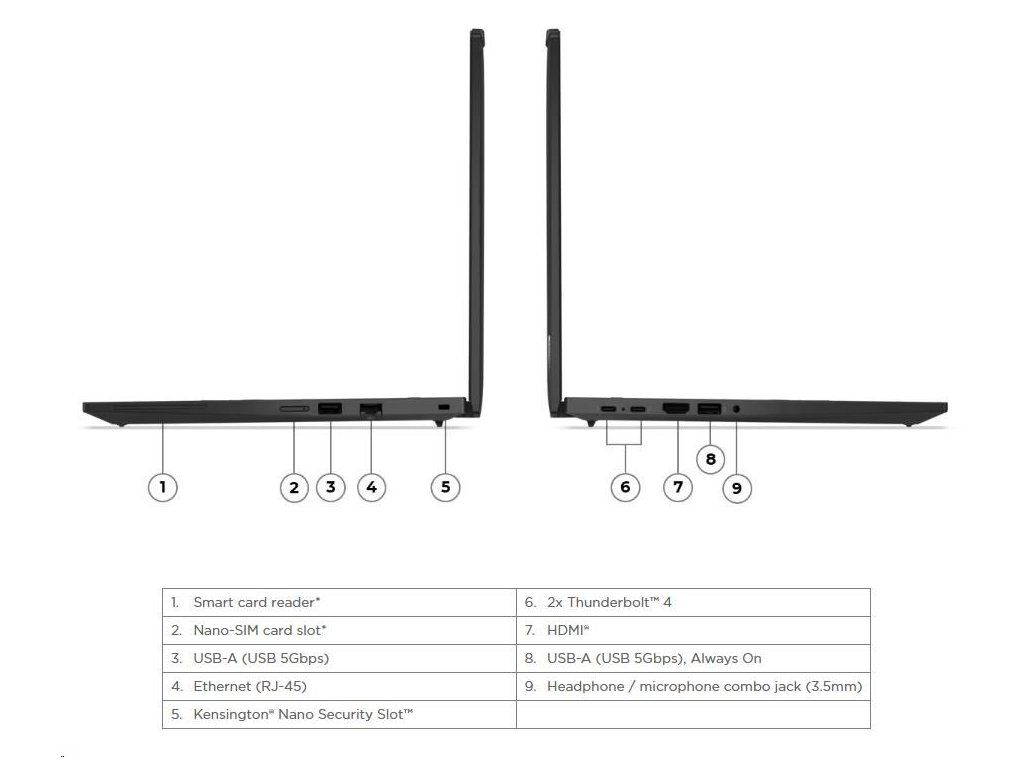 | Standartné porty | 1x USB-A (USB 5Gbps / USB 3.2 Gen 1) 1x USB-A (USB 5Gbps / USB 3.2 Gen 1), Always On 2x USB-C (Thunderbolt™ 4 / USB4 40Gbps), with USB PD 3.0 and DisplayPort™ 2.1 1x HDMI 2.1, up to 4K/60Hz 1x Headphone / microphone combo jack (3.5mm) 1x Ethernet (RJ-45) 1x Smart Card Reader 1x Nano-SIM Card Slot |