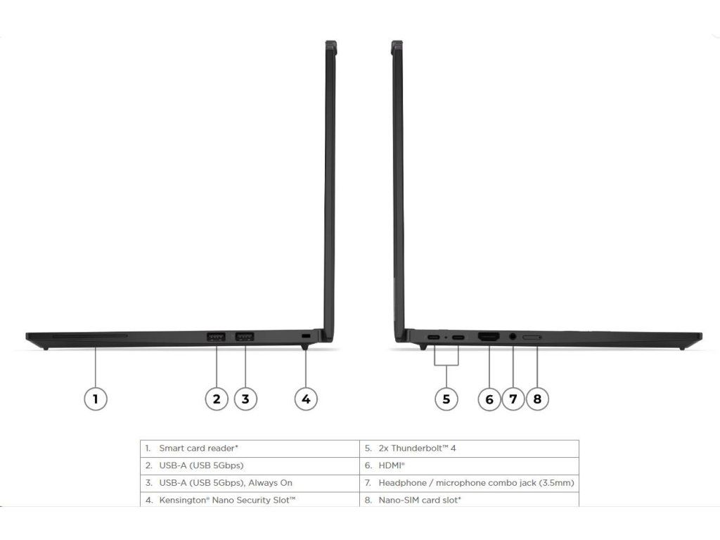 | Standartné porty | 1x USB-A (USB 5Gbps / USB 3.2 Gen 1) 1x USB-A (USB 5Gbps / USB 3.2 Gen 1), Always On 2x USB-C (Thunderbolt™ 4 / USB4 40Gbps), with USB PD 3.0 and DisplayPort™ 2.1 1x HDMI 2.1, up to 4K/60Hz 1x Headphone / microphone combo jack (3.5mm) |
