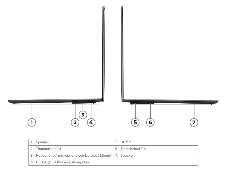 | Standartné porty | 1x USB-A (USB 10Gbps / USB 3.2 Gen 2), Always On 2x USB-C (Thunderbolt™ 4 / USB4 40Gbps), with USB PD 3.0 and DisplayPort™ 2.1 1x HDMI 2.1, up to 4K/60Hz 1x Headphone / microphone combo jack (3.5mm) |
