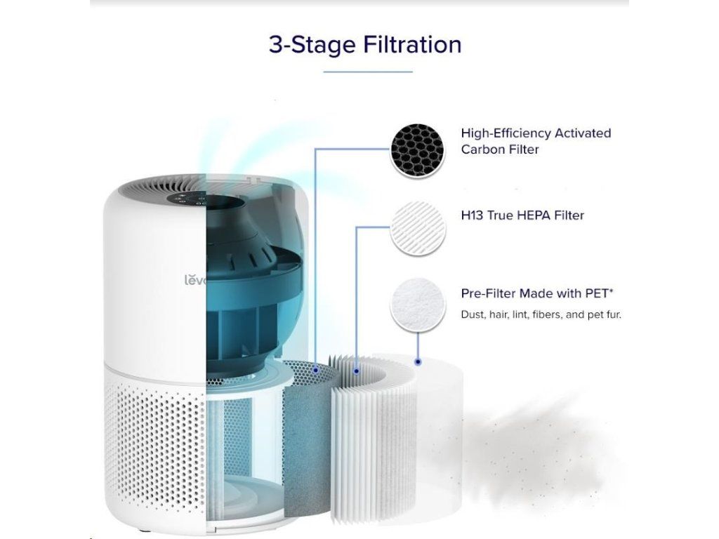 Druhou vrstvou je HEPA filter H13. To odlišuje Levoit od konkurencie, pretože filter HEPA H13 je oveľa kvalitnejší a spoľahlivejší ako bežne používané HEPA H11. Tu sa odfiltrujú jemné prachové častice, pleseň, baktérie, peľ, dymové častice, roztoče a srsť.