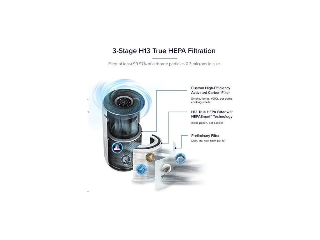 Druhou vrstvou je HEPA filter H13. To odlišuje Levoit od konkurencie, pretože filter HEPA H13 je oveľa kvalitnejší a spoľahlivejší ako bežne používané HEPA H11. Tu sa odfiltrujú jemné prachové častice, pleseň, baktérie, peľ, dymové častice, roztoče a srsť.