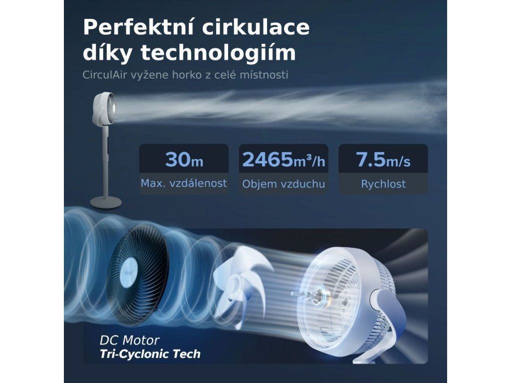 Ventilátor Levoit R432 Cyclone je ideálnym riešením na účinné a tiché chladenie vášho domova. Vďaka výkonnému jednosmernému motoru dosahuje prietok vzduchu až 2465 m3/h, rýchlosť vetra 7,5 m/s a dosah prúdenia vzduchu až 30 metrov. Tento ventilátor ponúka 12 úrovní manuálneho nastavenia rýchlosti, ktoré možno jednoducho ovládať pomocou diaľkového ovládania s dosahom až 6 metrov. Diaľkový ovládač je magneticky pripevnený k telu ventilátora, čo zabezpečuje jeho pohodlné uloženie a minimalizuje riziko straty.