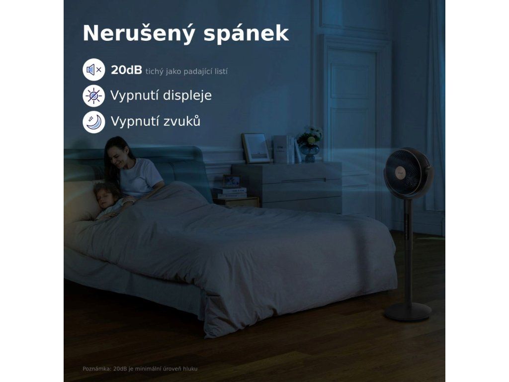 Stojanový ventilátor Levoit je ideálnym spoločníkom na pokojný spánok, pretože jeho hlučnosť je len 20 dB, čo je porovnateľné s šepotom. Pre maximálne pohodlie môžete jednoducho vypnúť displej, aby vás počas noci nerušili žiadne svetelné signály. Navyše možno deaktivovať všetky zvuky, čím sa zabezpečí, že vás nič nebude rušiť z odpočinku a relaxácie.