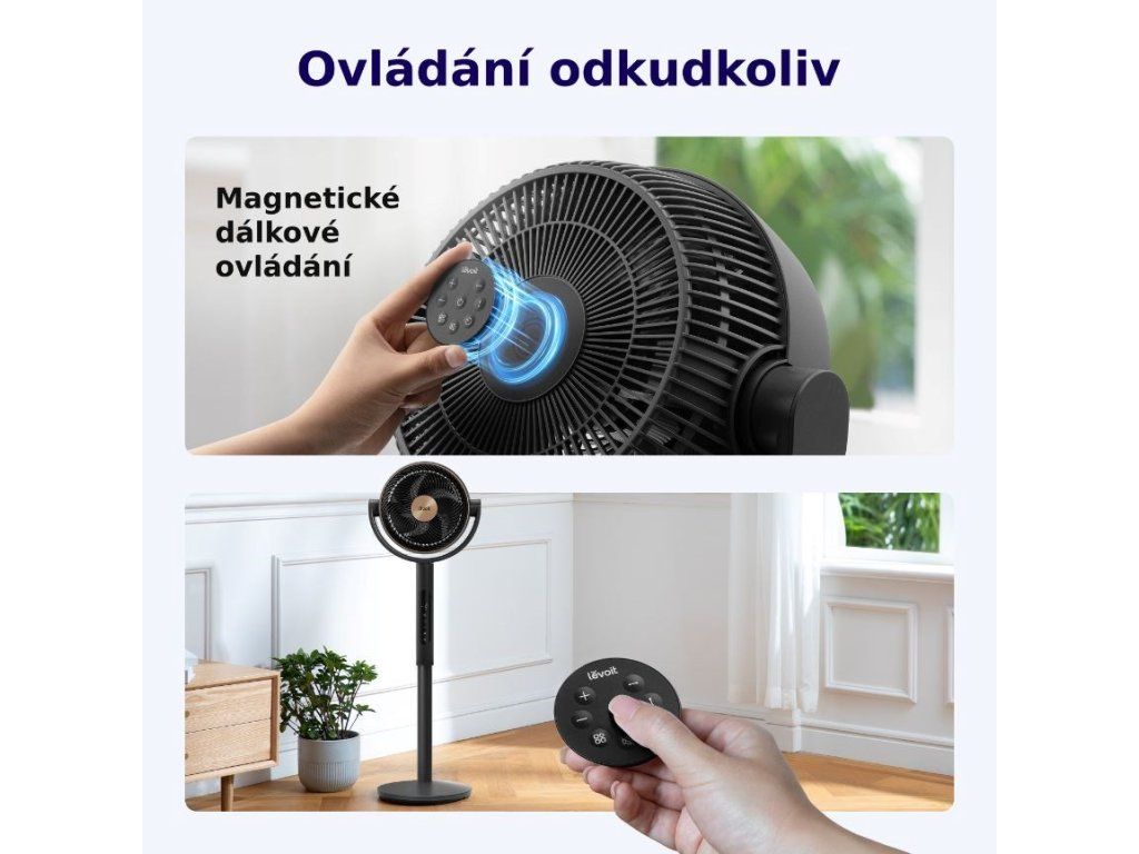 Stojanový ventilátor Levoit je vybavený praktickým magnetickým diaľkovým ovládaním, ktoré sa ľahko pripevní na stred ventilátora, takže ho budete mať vždy na očiach. Tento šikovný dizajn zaručuje, že diaľkové ovládanie už nikdy nestratíte a budete ho mať po ruke vždy, keď ho budete potrebovať. Ovládanie funguje na diaľku, takže môžete nastavenia upravovať pokojne po celej miestnosti bez toho, aby ste museli vstávať z pohodlia kresla alebo postele.