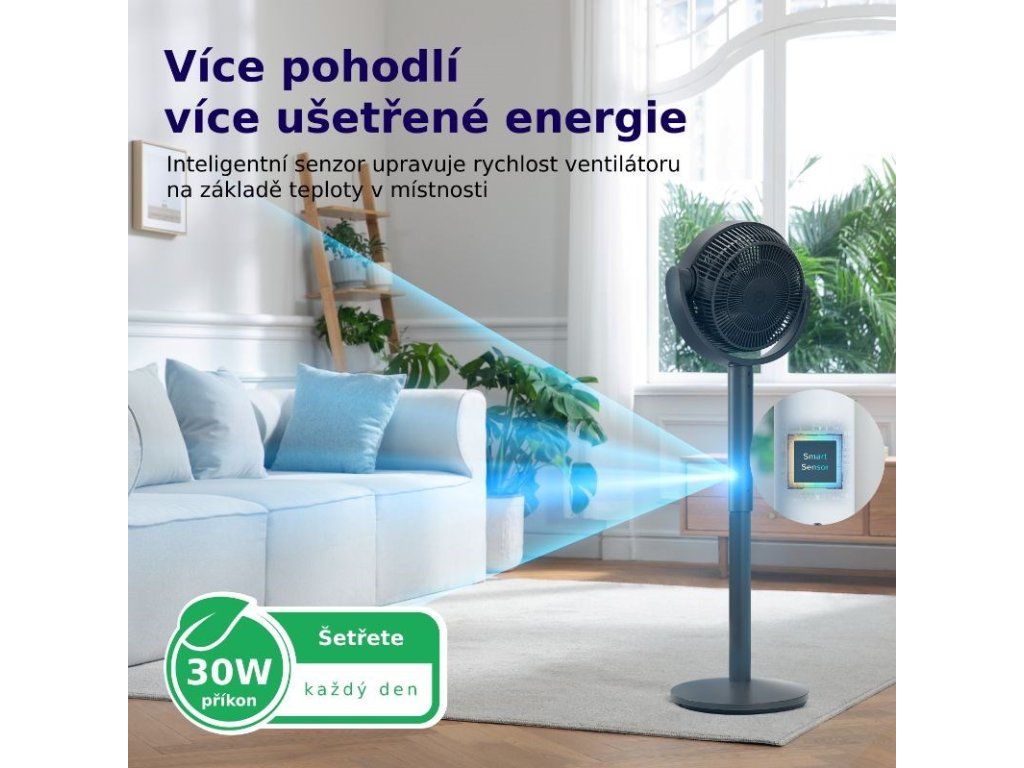 Stojanový ventilátor Levoit je vybavený snímačom teploty, ktorý automaticky reguluje výkon podľa aktuálnej teploty v miestnosti, čím zabezpečuje optimálny komfort. Vďaka nízkej spotrebe energie len 28 W je tento ventilátor energeticky úsporným riešením na každodenné používanie. Navyše ponúka 12 rýchlostí, ktoré umožňujú plynulú prevádzku bez náhlych prechodov, takže si môžete ľahko nastaviť ideálnu úroveň chladenia podľa svojich potrieb.