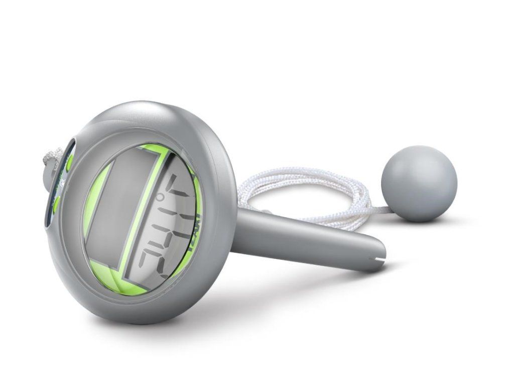 Digitálny ponorný solárny teplomer určený na meranie teploty vody v bazéne.