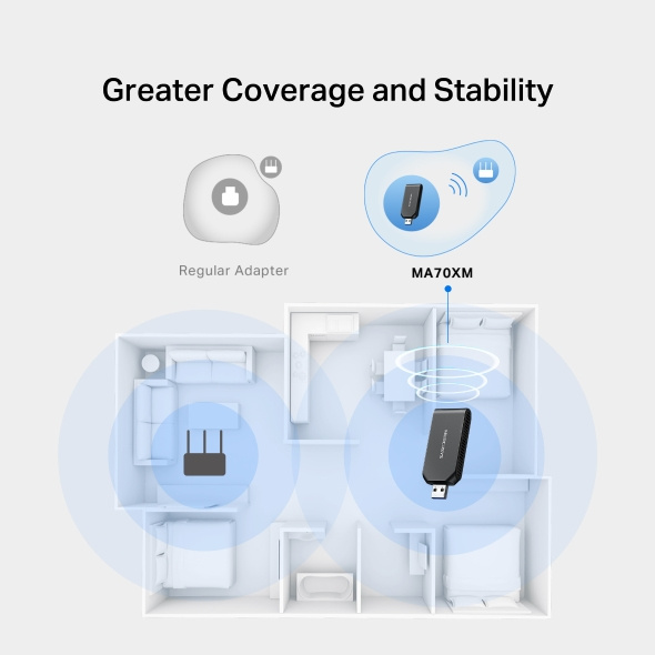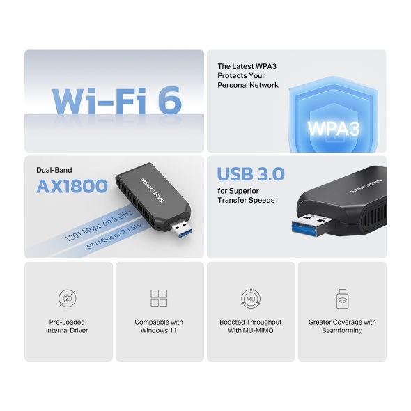Bezdrátový USB adaptér Wi-Fi 6 MERCUSYS MA70XM Zažijte vysokorychlostní Wi-Fi 6, která zvládne více zařízení najednou a poskytne bezpečný a rychlý internet pro hraní, streamování i práci z domova. *