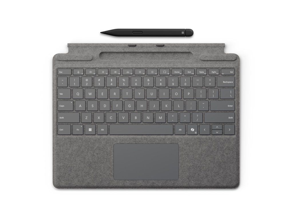 klávesnice Surface Pro s perem Slim Pen Posuňte všestrannost na novou úroveň s perfektní prémiovou klávesnicí s mechanickými a podsvícenými klávesami, která nabízí skleněný touchpad a zbrusu novou klávesu Copilot, abyste měli AI na dosah ruky. Díky integrovanému slotu Surface Slim Pen máte zajištěné bezpečné a snadné dobíjení.