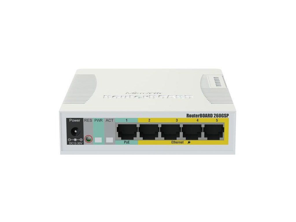 MikroTik RB260GSP (CSS106-1G-4P-1S) Systémové řešení platforem firmy MikroTik pro poskytovatele bezdrátového připojení k síti Internet.PŘEHLED RouterBOARD RB260GSP je 5-ti portový gigabitový web management smart switch běžící na novém proprietárním softwarovém řešení Mikrotiku SwOS. Na portech 2-5 umožňuje POE napájení připojených aktivních prvků o stejném příkonu, jakým je switch napájen. Dodávaný jako komplet v indoor plastovém case spolu se zdrojem jako hotové SOHO řešení. Jeden gigabitový ethernet SFP port. Z některých podporovaných funkcí a parametrů: • port-to-port forwarding • MAC filter • mirror traffic • omezování rychlostí (bandwidth limitation) • úpravy polí MAC a IP Editace VLAN prostřednictvím 4 základních módů: • Disabled – ignore VLAN table • Optional – drop packets with restricted VLAN tags • Enabled – accept packets with allowed VLAN tags • Strict – same as Enable, but also checks VLAN support for inbound interface