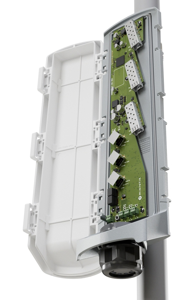 Specifikace: *model switch čipu: 88E6193X *operační systém: SwOS *MTBF (mezidobý stav mezi poruchami): přibližně 200 000 hodin při 25°C *IP krytí: IP66 *monitor teploty CPU: ano