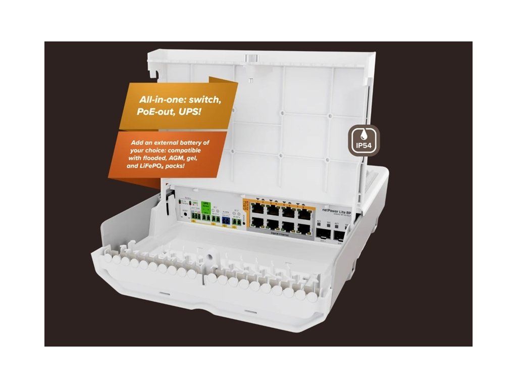 MikroTik netPower Lite 8P Nízká cena. Odolnost. A vždy zapnuto! Kompaktní PoE switch s vestavěnou UPS a inteligentní nabíječkou baterií – protože vaše CCTV kamery a přístupové body si zaslouží skutečnou odolnost i mimo napájecí síť.