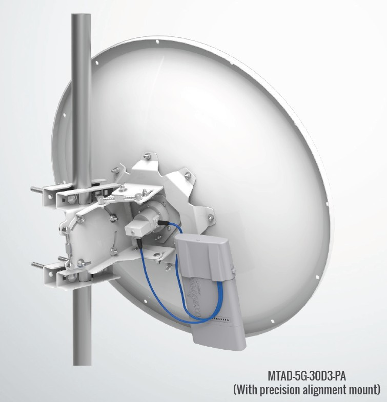 TECHNICKÁ SPECIFIKACE *Product PN: MTAD-5G-30D3-PA *Frequency Range: 4.7-5.875 GHz *Gain: 30 dBi typically *Dual Polarization: Vertical and Horizontal *3dB Beamwidth: +/-2.5 deg *Standards: EN 302 326 DN1, DN2, DN3, DN5 *VSWR: min. 1.4 / max. 1.8 *Port to Port Isolation: >40dB min *Front-to-Back Ratio: >30 dB *Cross Polarization: >40 dB *Power Rating: 100 watts *Impedance: 50 ohms *Elevation adjustment range: +/-15 deg *Diameter x Depth: 70 x 45cm (27.5 x 17.8in) *Weight: 5.7kg *Reflector: Aluminum *Outdoor Rating: ETSI EN 300 019-2-4 *Wind Survivability: 201km/h *Wind Load: (125 mph) 181.4kg (400 lbs), 79kg (174 lbs) with radome *Operating Temperature: -50°C to 80°C(-49°F to 158°F) *Pole Mount Diameter Range: 3 - 10cm *Connector: 2x RP-SMA Female (outside thread) *Packaged size: 73x73x20cm *Packaged weight: 8.4 kg *Součásti dodávky: 2ks FlexGuide RPSMA RF Cables (RP-SMA-male to RP-SMA-male) 1ks Bracket for mounting BASEBOX series radio 2ks Self-Bonding Tape for insulating the RF cables 1ks montážní mechanismus k uchycení ke stožáru a přesnému zaměření