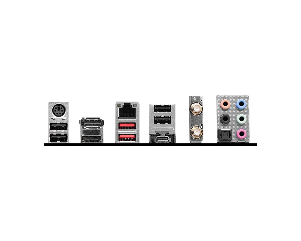 Porty na zadním panelu: * 1x USB 3.2 Gen 2 10Gb/s (typ C) * 2x USB 3.2 Gen 2 10Gb/s (typ-A) * 4x USB 2.0 * 1x HDMI® * 1x DisplayPort * 1x RJ-45 2,5G LAN * 1x Wi-Fi/Bluetooth * 1x PS/2 pro klávesnici/myš * 5x audio jack * 1x optický S/PDIF Out