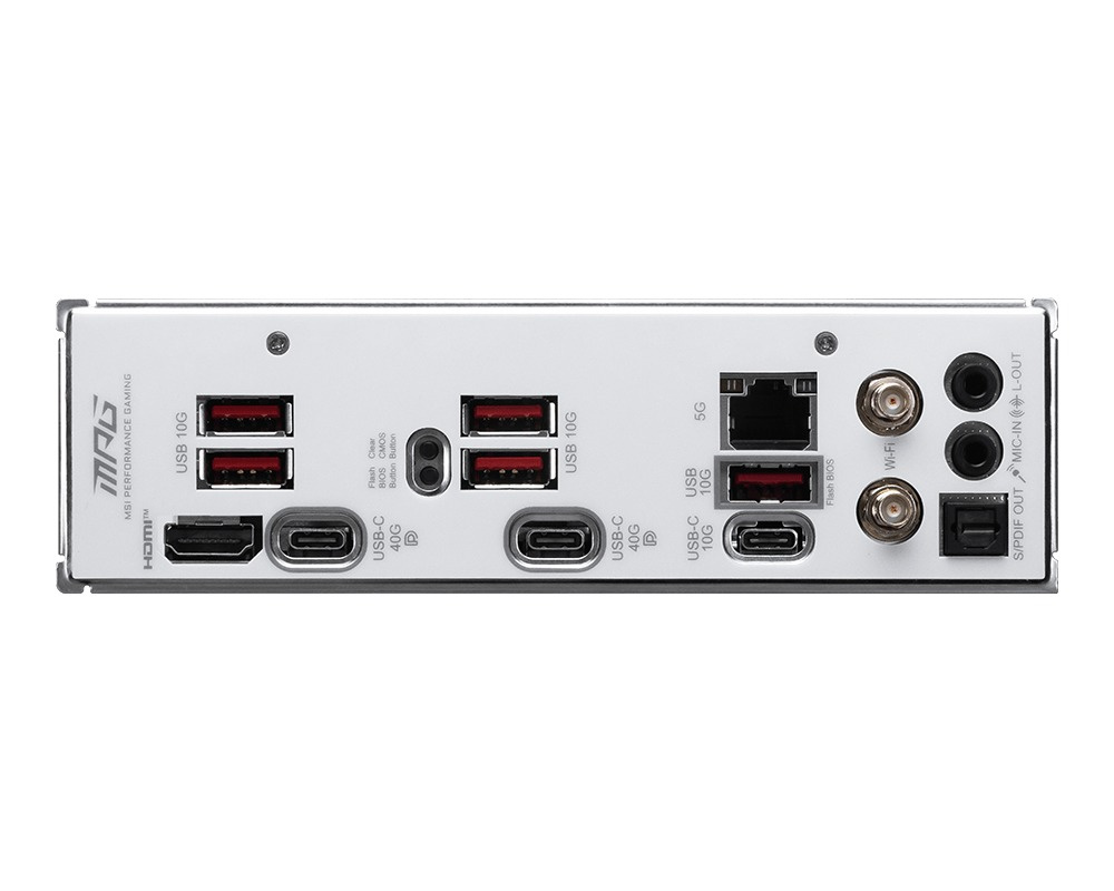 Porty na zadním panelu: * 2x USB 4.0 40Gb/s (typ C) * 1x USB 3.2 Gen 2 10Gb/s (typ C) * 5x USB 3.2 Gen 2 10Gb/s (typ A) * 1x HDMI™ * 1x RJ-45 5G LAN * 1x Wi-Fi/Bluetooth * 2x audio konektor * 1x S/PDIF out * 1x tlačítko Flash BIOS * 1x tlačítko Clear CMOS