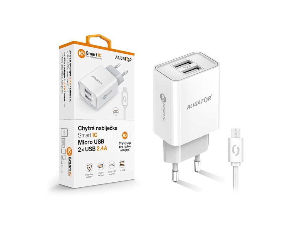 Múdra sieťová nabíjačka ALIGATOR 2,4A, 2xUSB, smart IC, biela, micro USB kábel