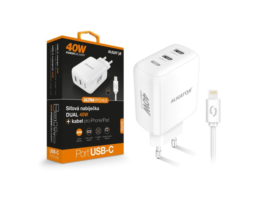 Výkonná a SMART Rychlá síťová nabíječka 2xUSB-C ALIGATOR Power Delivery 40W s kabelem USB-C/Lightning pro iPhone/iPad Výkonná síťová nabíječka řady „POWER DELIVERY“ v moderním bílém provedení s dvěma ultra rychlými USB-C porty o výkonu 40W. Součástí balení je kabel USB-C/Lightning pro iPhone/iPad. 2xUSB-C port o výkonu 40W V dnešní době jsou již konektory USB-C s podporou protokolu PD standardem pro nabíjení mobilních zařízení. Chytrá síťová nabíječka ALIGATOR POWER DELIVERY 40W zvládne tak hravě doplnit energii dvěma přístrojům najednou díky ultra rychlým USB-C portům o celkovém výkonu až 40W. Tato nabíječka je ideálním pomocníkem pro dobíjení mobilních telefonů, tabletů a jiných zařízení. Až 10x rychlejší oproti běžné USB nabíječce Power Delivery je technologie rychlého nabíjení, která uživateli poskytuje vyšší výkon a zkracuje dobu nabíjení pomocí konektoru USB-C. USB-C kabel pro iPhone/iPad součástí balení Všestranné využití nabízí USB-C kabel pro iPhone/iPad, který je součástí balení. Díky podpoře protokolu Power Delivery a nabíjecímu proudu až 3A je takřka nepostradatelným doplňkem nabíječek Aligator Power Delivery. Doma, v kanceláři i na cestách… Prostě kdekoliv! Kompatibilní s většinou zařízení. Technické parametry: Vstup: AC 100-240V Výstup: USB-C 1: DC 5V-3A, 9V-2.22A, 12V-1.67A USB-C 2: DC 5V-3A, 9V-2.22A, 12V-1.67A USB-C 1 + USB-C 2: 20W+20W Power Delivery 40W Ochrana proti zkratu a přetížení USB-C kabel pro iPhone/iPad Barva: bíláDodatočné parametre