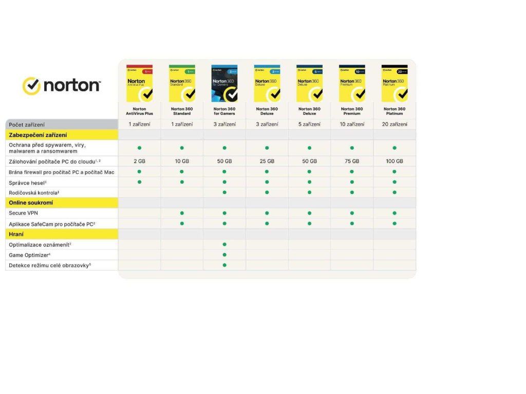 Norton 360 Standard poskytuje komplexnú ochranu proti škodlivému softvéru pre jeden počítač PC, Mac, zariadenie so systémom Android alebo iOS, ako aj funkciu cloudového zálohovania pre počítač, ktorá pomáha predchádzať strate údajov v dôsledku ransomvéru alebo zlyhania pevného disku, a správcu hesiel na ukladanie a správu hesiel.