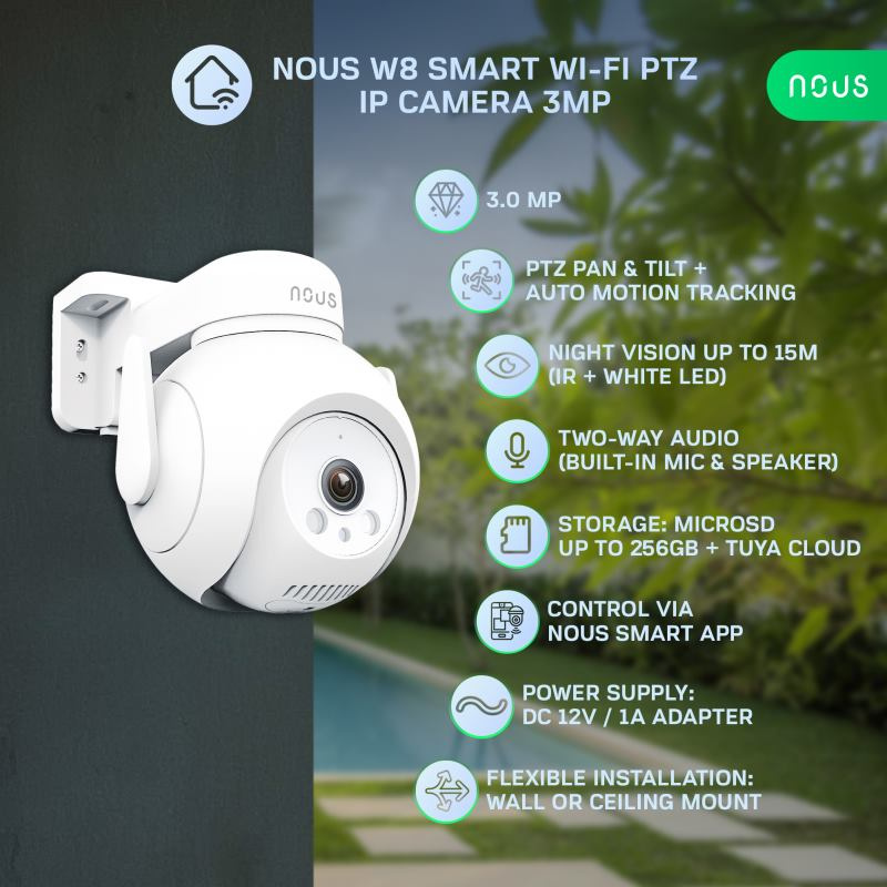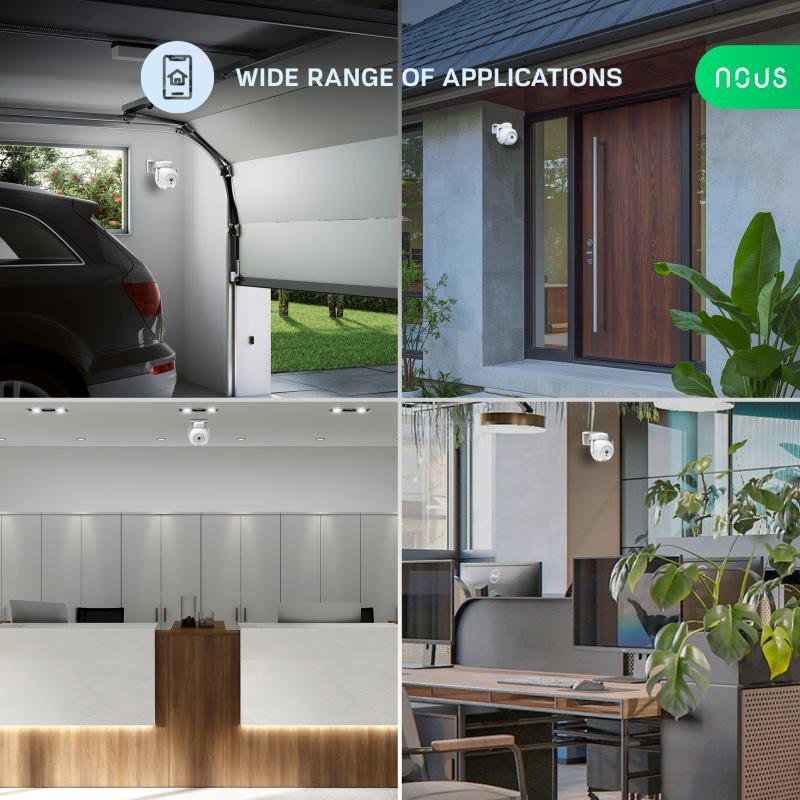 Všetky funkcie kamery máte na dosah ruky vďaka intuitívnym mobilným aplikáciám NOUS Smart Home a Tuya Smart. Sledujte živý prenos, otáčajte kamerou, prehrávajte záznamy a spravujte nastavenia pohodlne zo svojho telefónu alebo tabletu. Kamera sa pripája k vašej domácej 2,4 GHz Wi-Fi sieti.
