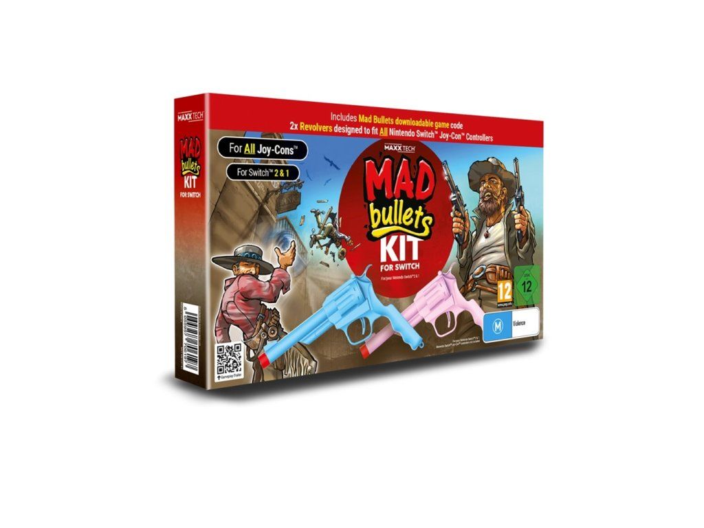Kompatibilní s Nintendo Switch™ 2 a 1! Pro všechny ovladače Joy-Cons! Nová sada Mad Bullets Kit pro Nintendo Switch 2 a 1 obsahuje dva revolvery navržené pro ovladače Joy-Con Nintendo Switch 2 a 1 a digitální kód ke stažení hry Mad Bullets. Tato bláznivá střílečka intenzivně prověří vaše reflexy i bránici. Zapomeňte na nudné příběhy, složité ovládání a otravnou výuku a skočte rovnou do rychlé akce, ze které se vám zatočí hlava. Balení obsahuje: *2x revolvery *1x kód ke stažení hry Mad Bullets *2x adaptéry