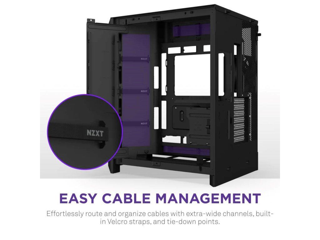 • Intuitívny systém správy káblov s širokými kanálmi, vestavenými háčikmi a priloženými páskami pre jednoduché vedenie.