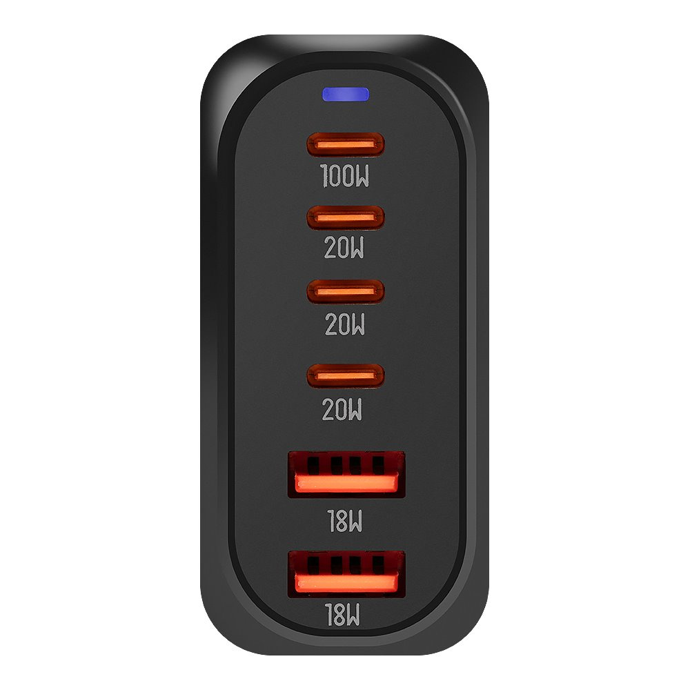 Technická specifikace *Vstup: 100–240 V ~ 50/60 Hz, 2.5 A max *Celkový výkon: 100 W max *Porty: 4× USB-C + 2× USB-A *USB-C1: 5 V = 3 A / 9 V = 3 A / 12 V = 3 A / 15 V = 3 A / 20 V = 5 A (až 100 W při samostatném použití) *USB-C2 / USB-C3 / USB-C4: až 20 W na port (podle konfigurace) *USB-A1 / USB-A2: až 18 W na port (podle konfigurace) *Sdílený výkon (více portů): Dynamické rozdělení, celkově max 100 W *Materiál: PC + ABS, matný povrch *Rozměry: 85 × 85 × 30 mm