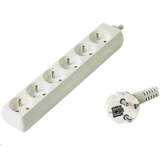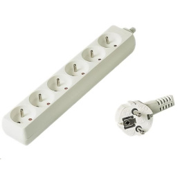 Praktický predlžovací kábel so 6 zásuvkami. - Počet zásuviek: 6 - Istič: nie - Maximálne napätie: 250 V - Maximálny prúd: 10 A - Maximálna záťaž: 2300 W - Vodič kábla: H05VV-F3G 1 mm2 - Detská poistka - ochrana pred deťmi: áno - Materiál: kábel: PVC, zásuvky: ABS plast - Balené v PE vrecku so závesným systémom. - Farba kábla a zásuvky: biela - Dĺžka kábla: 5 m.
