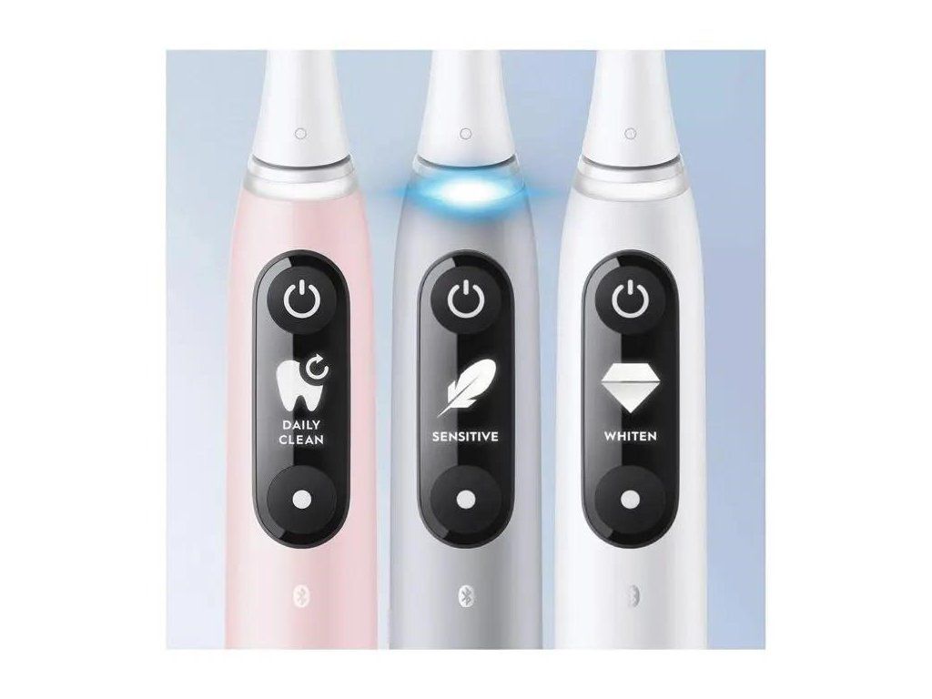 Oral-B iO pomáha chrániť ďasná pred nadmerným tlakom. Inteligentná kontrola tlaku varuje červeným svetlom, ak vyvíjate príliš veľký tlak, a rozsvieti sa zeleno, ak používate optimálny tlak. Interaktívny displej umožňuje jednoduchú orientáciu v rôznych funkciách a nastaveniach kefky. Môžete si vybrať medzi rôznymi režimami čistenia, v reálnom čase získate personalizované pokyny a upozornenia na výmenu hlavice kefky. Vizuálny časovač poskytuje informácie o odporúčanej dobe čistenia 2 minúty. Zubná kefka vás ráno privíta a po vyčistení zubov vám vykúzli úsmev na tvári pre vynikajúce výsledky. Zažite zážitok z čistenia zubov, ktorý vás inšpiruje!