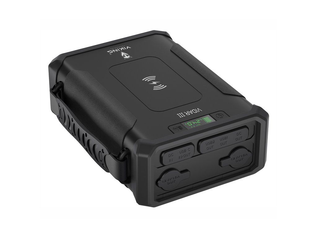 Outdoorová powerbanka Viking VIDAR III • Kapacita: 96000mAh/307.2Wh • Maximální výkon: 180W • Zabudované LED světlo • Široká škála vstupů a výstupů (USB-A, USB-C, Cigaretová zásuvka, DC-jack, WIRELESS Qi) • Možnost solárního napájení • Funkce Pass-Through • Odolnost IP65