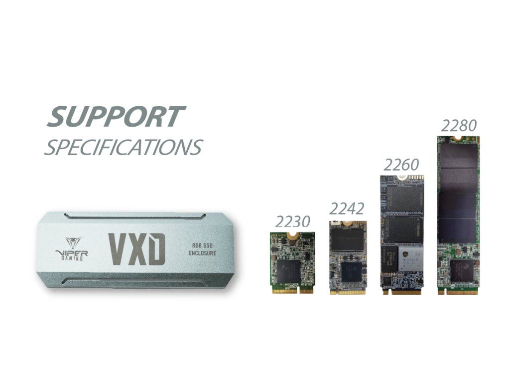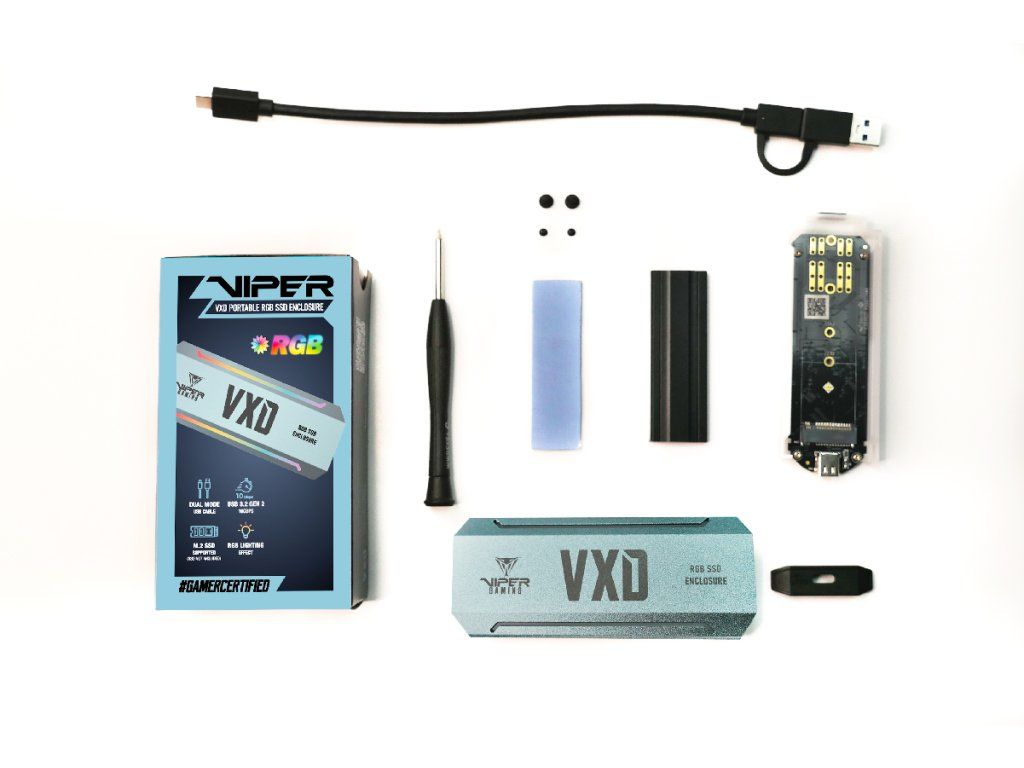 Patriot VXD M.2 externí box pro M.2 SSD * poskytuje vysoké přenosové rychlosti USB 3.2 Gen2 rozhraní (rychlost až 1000 MB/s) a univerzálnost USB typ-C rozhraní * funguje jako pasivní chladič a nabízí stylový hliníkový design, doplněný o RGB osvětlení * sníží teplotu disku až o 40% Kompatibilní s M.2 PCIe 3.0 x4 NVMe disky (M.2 2230/42/60/80). Podporuje kapacity disků v rozmezí 120 GB až 4 TB. Recenze: Patriot Viper VXD M.2 SSD Enclosure Review | ThinkComputers.org